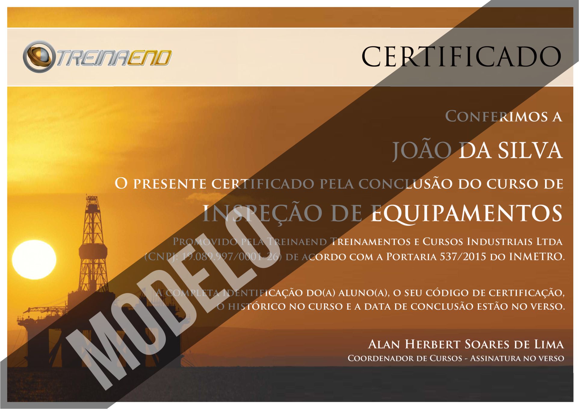 No Brasil todo curso de Inspetor de Equipamentos só terá reconhecimento legal se o mesmo estiver em conformidade com a Portaria 537/2015 do Ministério do Desenvolvimento, Indústria e Comércio Exterior / Inmetro - Governo Federal. O curso ministrado pela TREINAEND está em total conformidade com esta portaria, sendo assim válido e regular em todo território nacional.