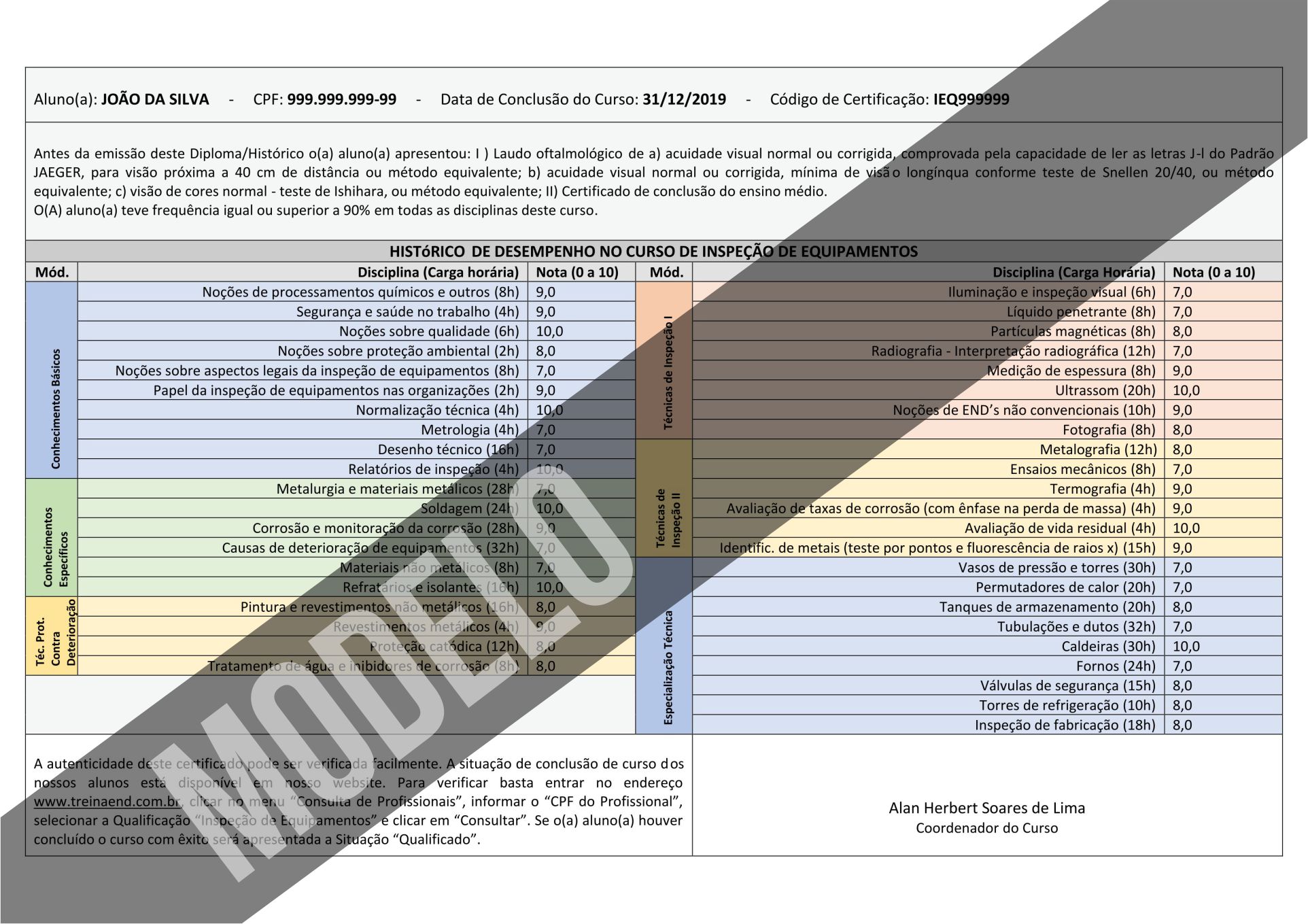 De acordo com o INMETRO, o aluno será considerado apto (QUALIFICADO) para exercer a função de Inspetor de Equipamentos após a conclusão do curso com aprovação em todas as disciplinas. Esta aprovação se dá com nota igual ou superior a 7.0 (sete).